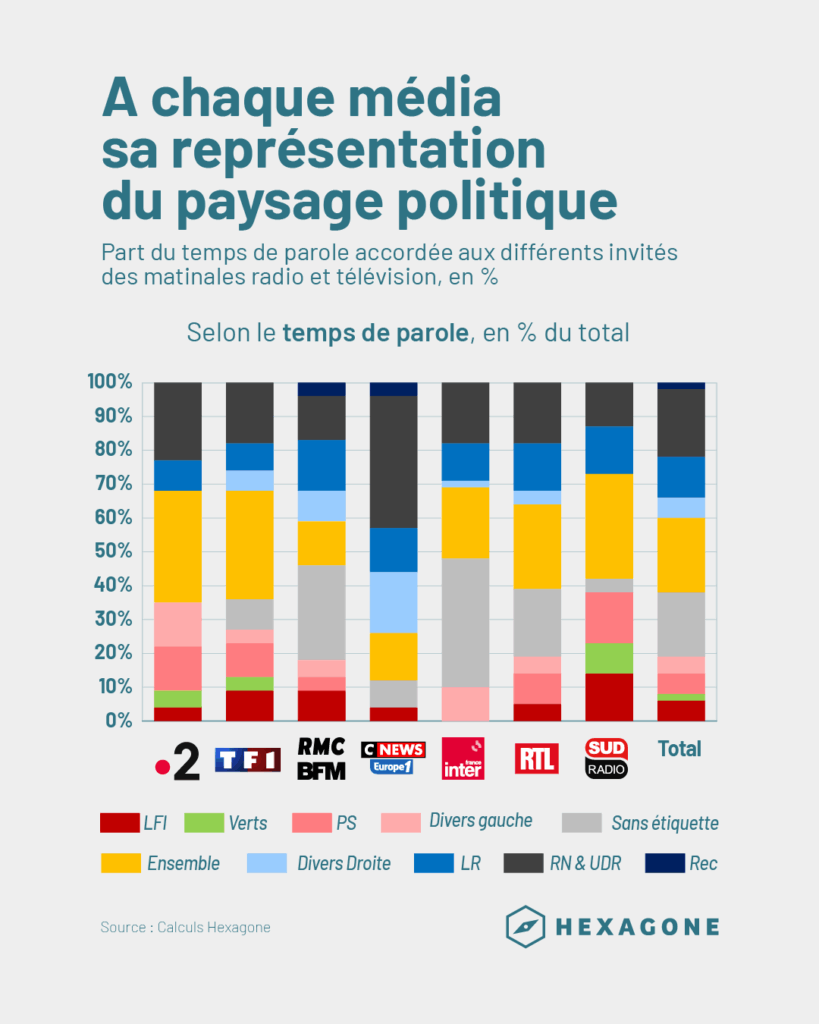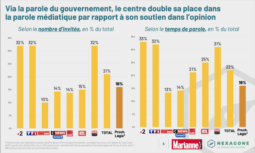 Résultat : alors que le parti présidentiel ne recueille plus qu’environ 16 % des intentions de vote, il occupe plus d’un cinquième du temps de parole dans les matinales, et même davantage sur certaines chaînes : 33 % sur France 2, 32 % sur TF1 ou encore 31 % sur Sud Radio. À l’inverse, les chaînes d’information en continu réservent une place bien plus réduite au camp centriste, avec 13 % sur BFMTV et 14 % sur CNews-Europe 1.