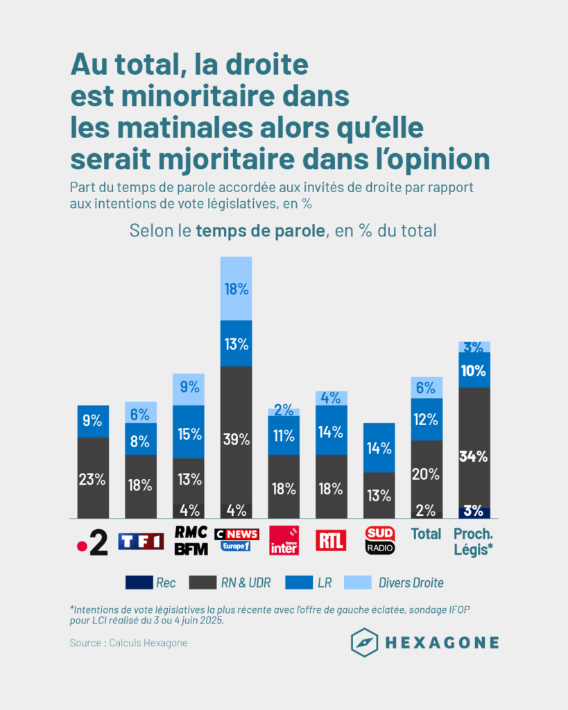 Les candidats et partis de droite, des Républicains à Reconquête, rassemblent aujourd’hui environ 50 % des intentions de vote, un niveau inédit depuis plusieurs années. Pourtant, leur visibilité médiatique reste en retrait : 38 % des invitations dans les matinales et 40 % du temps d’expression « seulement ». Comme la gauche, la droite est donc sous-représentée, mais avec une particularité : ce décalage se retrouve aussi bien sur le service public (France 2) que sur les grandes chaînes privées comme TF1. Seule CNews-Europe 1 inverse la tendance, avec 73 % des invités et 74 % du temps de parole accordés à la droite.