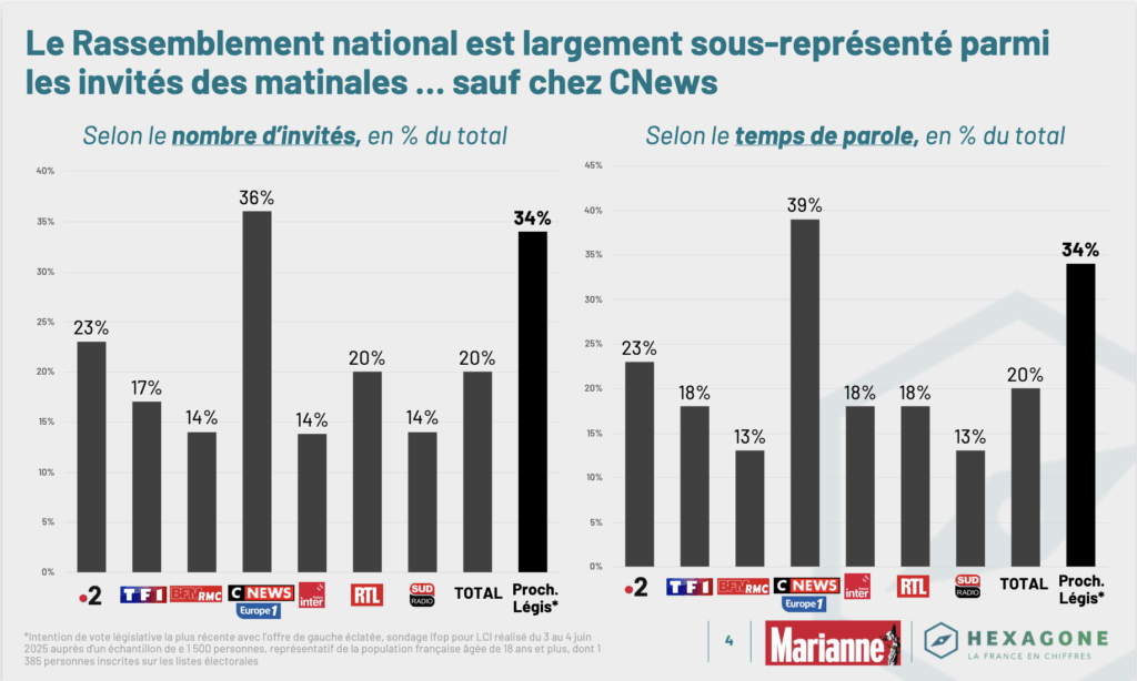 Dans les débats qui tournent autour de la présence de CNews-Europe 1 dans le paysage médiatique, et l’opportunité de son interdiction, Hexagone s’est penché sur son utilité dans la représentation juste des idées présentées par la chaine. Premier constat clair : contrairement à l’idée reçue, la parole du RN se révèle relativement marginale sur les différentes matinales par rapport à son poids dans l’opinion. Dans ce contexte, CNews-Europe 1 est le seul média à inviter des représentants du RN dans une proportion comparable à leurs représentativités dans l’électorat (36 % des invités contre 34 % des voix). Ainsi, la chaine du groupe Bolloré participe paradoxalement à un rééquilibrage global de la parole du RN dans les matinales de France.