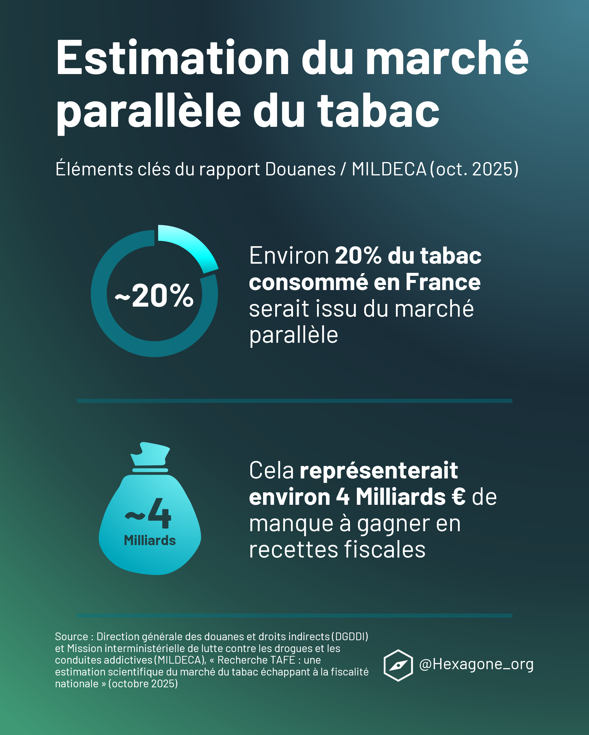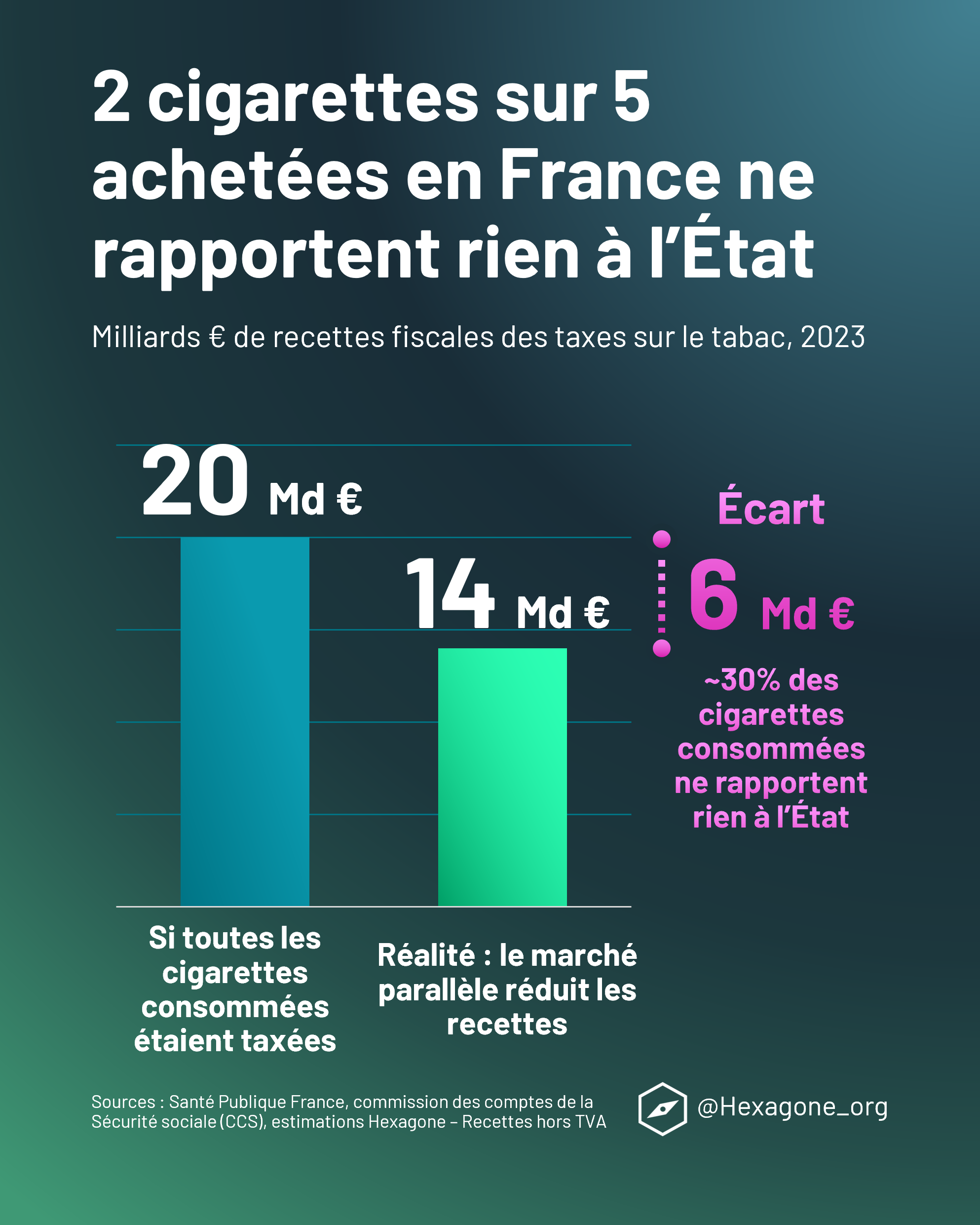 Hexagone trouve un chiffre intermédiaire : environ 30% des cigarettes consommées en France n’ont rapporté aucune recette fiscale, d’après un calcul mesurant l’écart entre les données de consommation Santé Publique France et les recettes effectivement collectées en 2023.