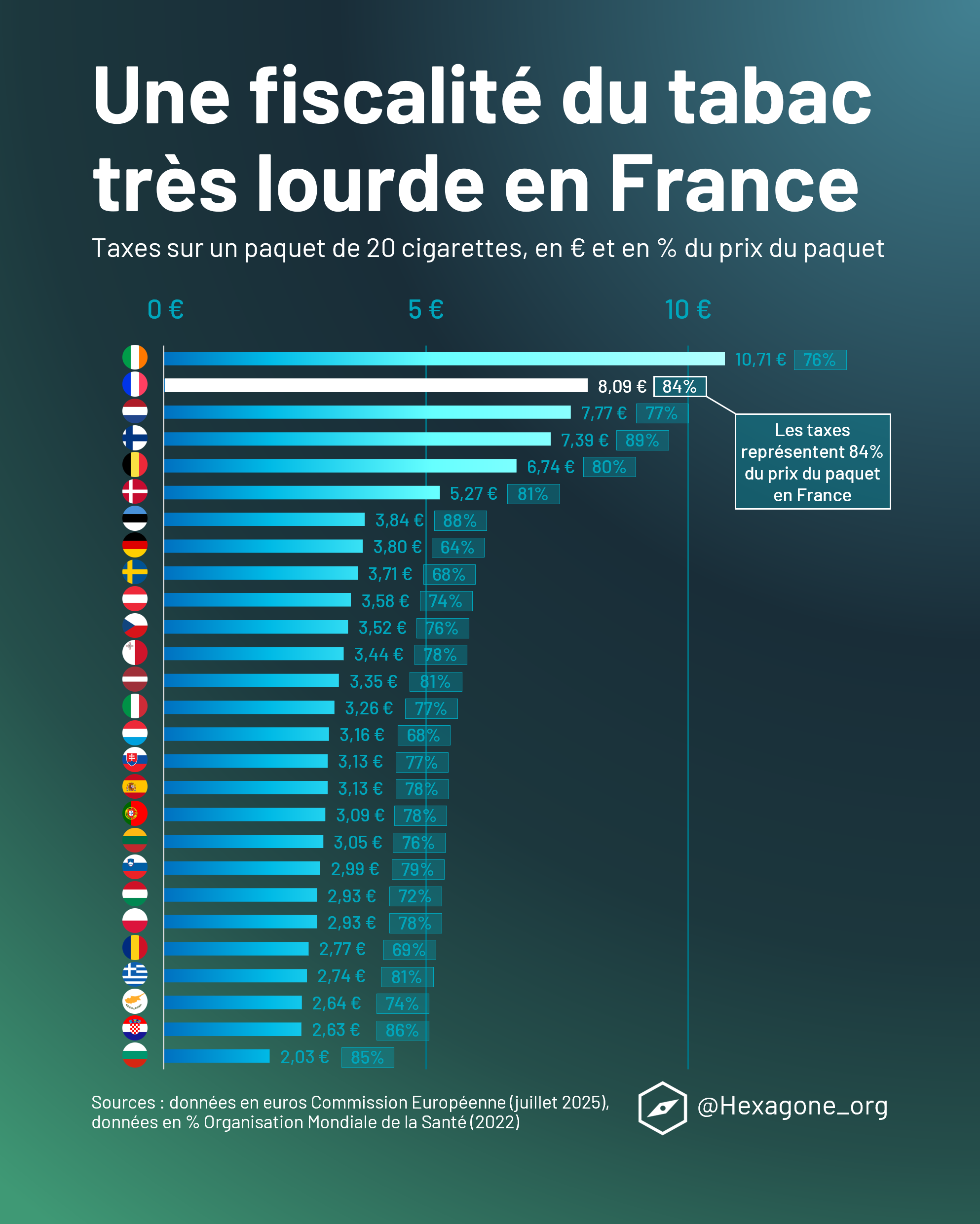 Afin de lutter contre le tabagisme, la France a donc mis en place une taxation particulièrement élevée sur les produits du tabac. Notre pays se situe dans le top-5 européen des États avec la plus lourde fiscalité sur le tabac, qu’on la mesure en euros ou en pourcentage du prix total du paquet de cigarettes.