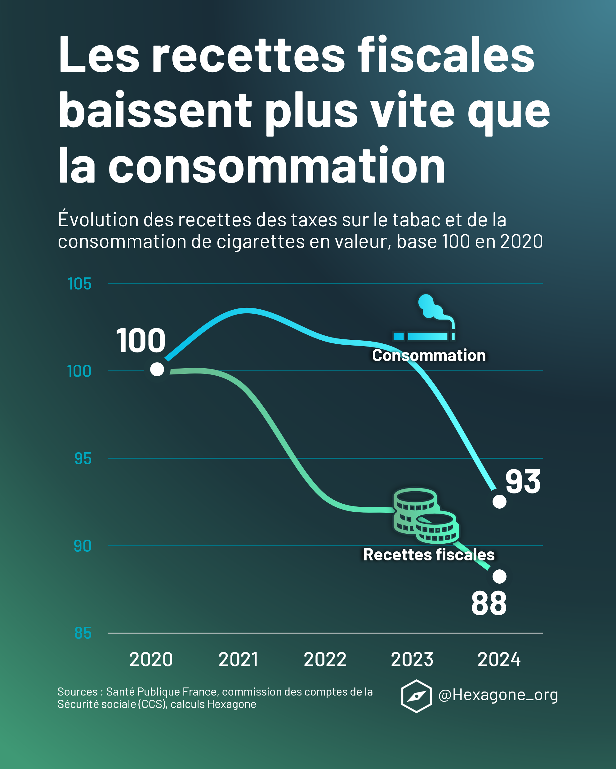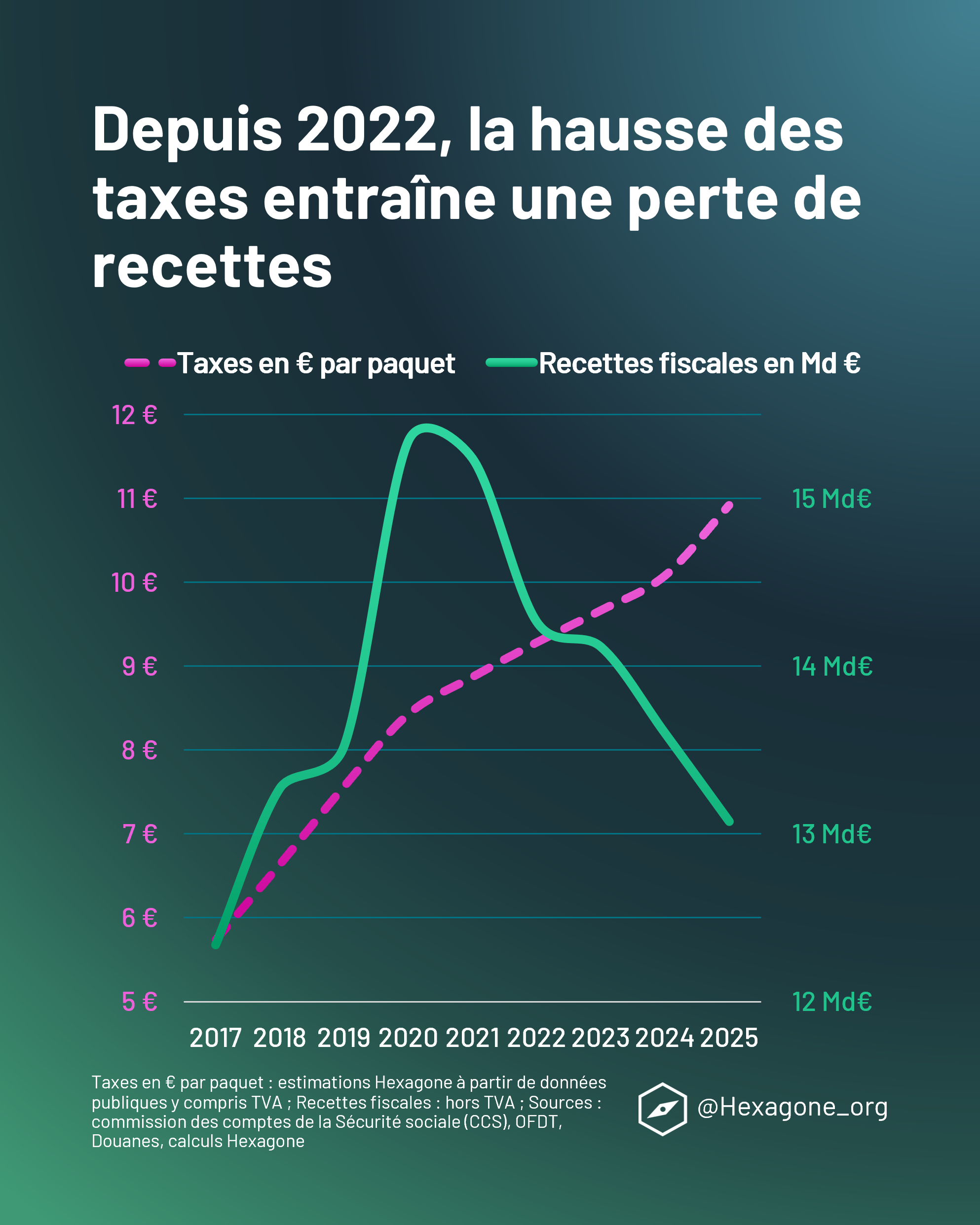 L’exemple du tabac est à ce titre particulièrement révélateur : les taxes collectées en moyenne sur un paquet de cigarettes sont en augmentation continue depuis 2017, alors que les recettes fiscales reculent depuis 2022.