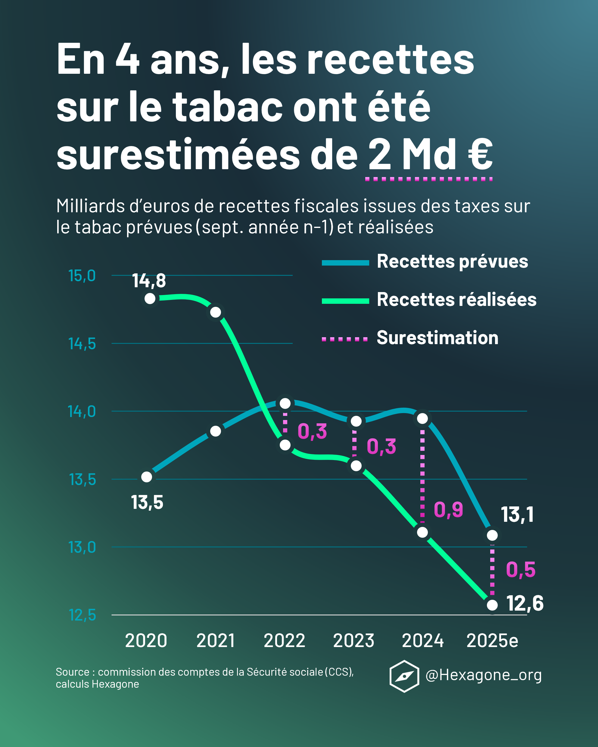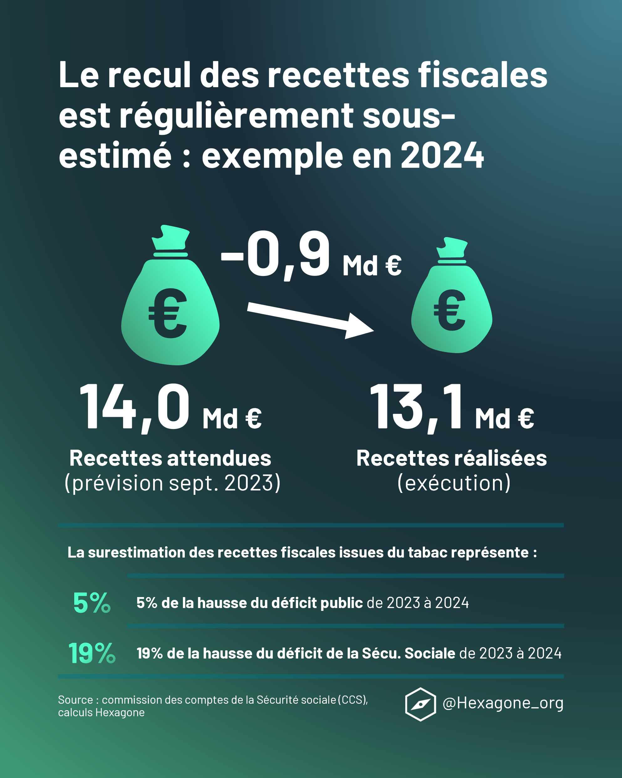 L’année 2024, pour laquelle le dérapage des comptes publics a été très important, est un cas d’école : alors que les recettes de la fiscalité sur le tabac devaient rapporter 14 Milliards d’euros aux comptes de la Sécurité Sociale, seuls 13,1 Milliards furent collectés. Un écart d’environ 900 Millions d’euros, représentant un cinquième de la hausse du déficit de la Sécu de 2023 à 2024.