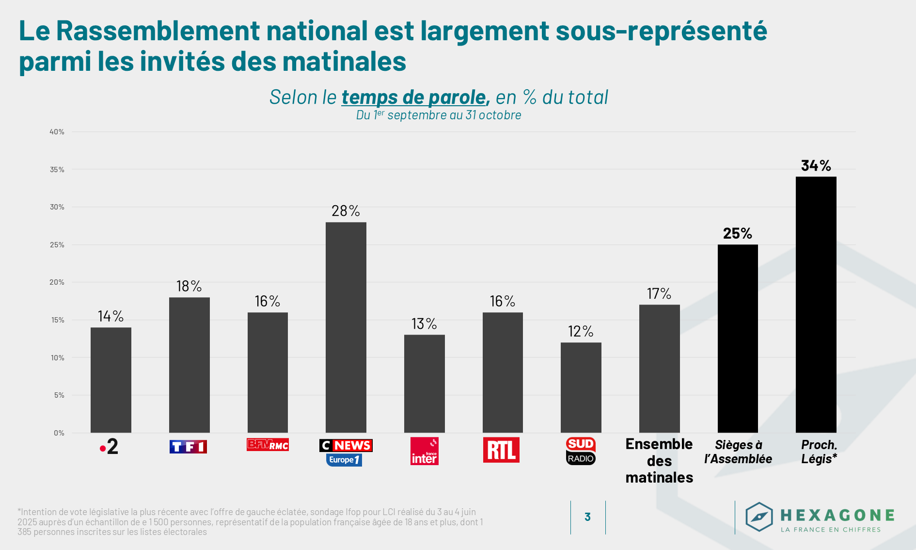Premier parti du pays en nombre de voix, 33 % lors des dernières législatives et 34 % dans les intentions de vote actuelles, le Rassemblement national souffre d’une sous-représentation de sa parole dans les grandes matinales. En incluant ses alliés de l’UDR d’Éric Ciotti, il ne représente que 17 % du temps de parole sur les sept principales émissions analysées.