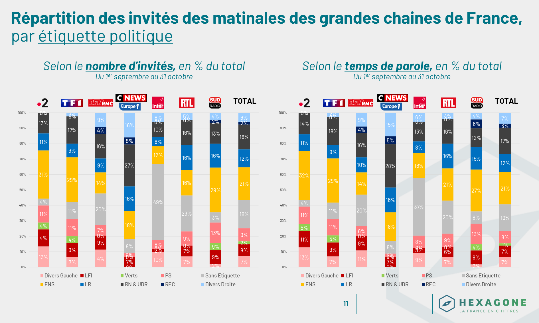 À la suite de notre première analyse des invités des principales matinales de France, sur le mois de septembre 2025, nous actualisons nos données en ajoutant celles du mois d’octobre 2025. Désormais, ce sont plus de 300 invités sur plus de 70 heures d’antenne qui sont recensés, en tenant compte à la fois de leur nombre et du temps de parole qui leur a été accordé. Ces données complétées confirment la sous-représentation de la parole de la droite et du Rassemblement national et une surreprésentation de la parole gouvernementale, du centre.