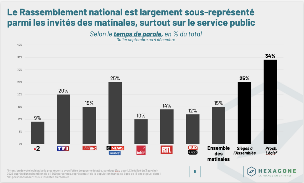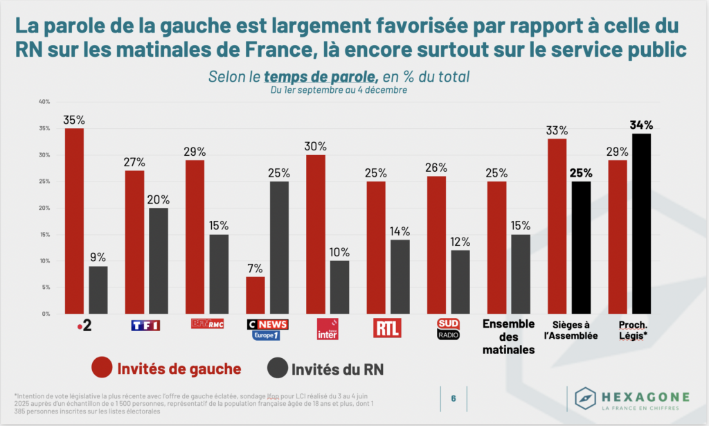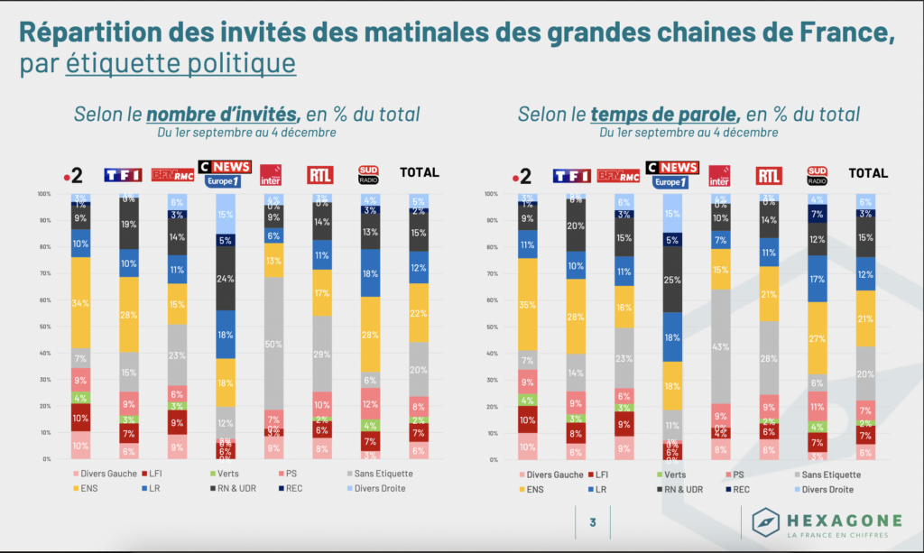 À la suite de notre première analyse des invités des principales matinales de France, sur le mois de septembre 2025, l’observatoire Hexagone actualise ses données en les complétant avec celles des mois d’octobre 2025 et de novembre 2025. Désormais, ce sont plus de 450 invités sur plus de 100 heures d’antenne qui sont recensés, en tenant compte à la fois de leur nombre et du temps de parole qui leur a été accordé. Nous avons également complété l’analyse en ajoutant le suivi de 3 émissions du service public : C Dans l’Air, C Ce Soir et C Politique. Ces données complétées confirment l’importante sous-représentation de la parole de la droite et surtout celle du Rassemblement national, ainsi qu’une surreprésentation de la parole gouvernementale, du centre, portée par les règles de l’équilibre du temps de parole de l’Arcom.