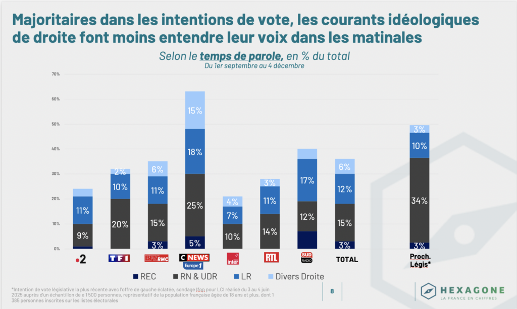 Les candidats et partis de droite, des Républicains à Reconquête, rassemblent aujourd’hui environ 50 % des intentions de vote, un niveau inédit depuis plusieurs années. Pourtant, leur visibilité médiatique reste en retrait : 36 % du temps d’expression « seulement ».