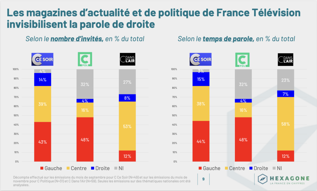 Sur 14 émissions de C Dans l’Air analysé, une émission qui met en valeur l’analyse éditorialisée par des invitations de journalistes et d’experts, seuls 8 % des invités et 7 % du temps de parole sont accordés aux analyses portées par des personnalités de droite. Dans C Politique, ces taux tombent même à respectivement 4 %. Sur les 3 émissions étudiées, seule C Ce Soir, qui invite régulièrement des élus, donne la parole à 14 % à des personnalités classées à droite, alors que dans l’opinion près d’un électeur sur deux voterait à droite.