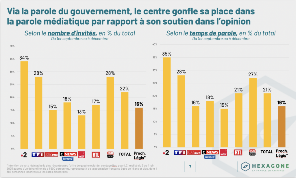 Le centre bénéficie d’une surexposition dans les matinales, portée par la parole gouvernementale, particulièrement valorisée en temps d’antenne par les règles de l’Arcom. Selon ces règles, en dehors des périodes électorales (qui correspond à notre analyse), radios et télévisions doivent compter le temps de parole de toutes les personnalités politiques, sur la base de périodes d’environ un trimestre, et s’assurer que le pouvoir exécutif (Président et gouvernement) ne dépasse pas environ un tiers du temps total d’intervention politique.