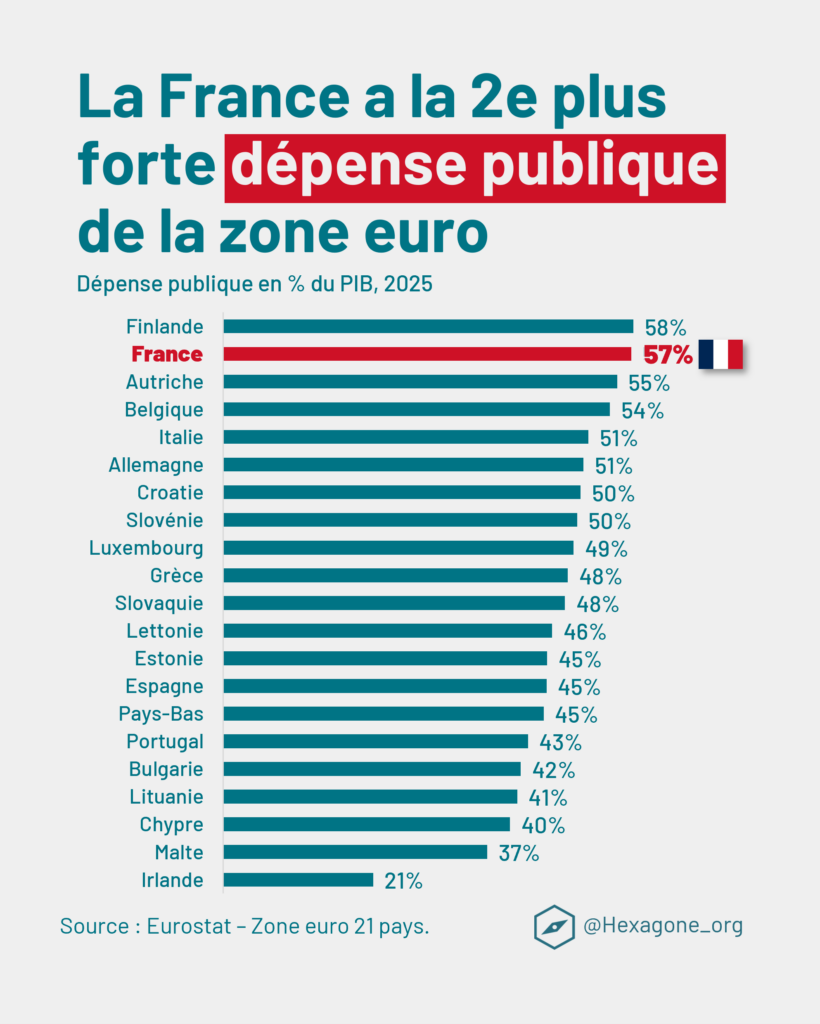 Le premier indicateur frappant concerne le poids de l’État dans l’économie. Avec une dépense publique culminant à 57 % du PIB, la France se hisse au deuxième rang de la zone euro, juste derrière la Finlande. Plus préoccupant encore que son niveau absolu, la dynamique reste orientée à la hausse : les dépenses ont progressé de 41 milliards d’euros par rapport à l’année précédente.