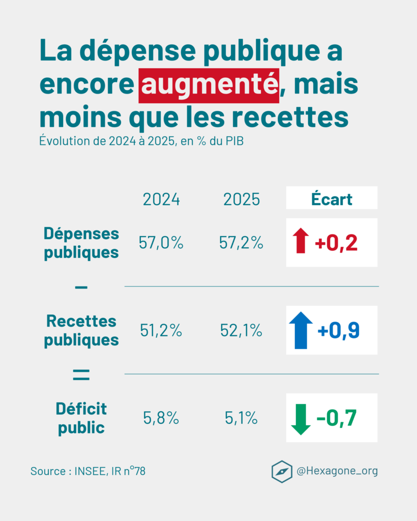 Certes, le déficit public a légèrement reculé pour s’établir à 5,1 % du PIB. Toutefois, ce chiffre masque une réalité moins flatteuse : ce n’est pas une baisse des dépenses qui a réduit l’écart, mais une hausse massive de la pression fiscale. Les recettes de l’État (impôts, taxes et cotisations) ont bondi de 58 milliards d’euros (+0,9 point de PIB), venant compenser l’envolée des dépenses.