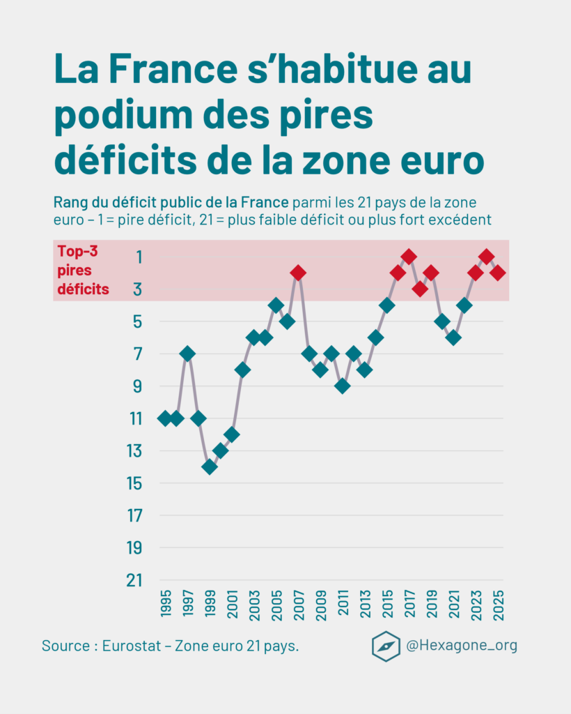 Malgré cet effort fiscal record demandé aux contribuables, la France reste sur le podium des pires élèves de la zone euro en matière de déficit. Cette situation n’est pas une fatalité historique, mais une dérive récente : si le pays s’est installé durablement dans ce “top 3” depuis 2016, il n’y était apparu qu’une seule fois auparavant, en 2007.