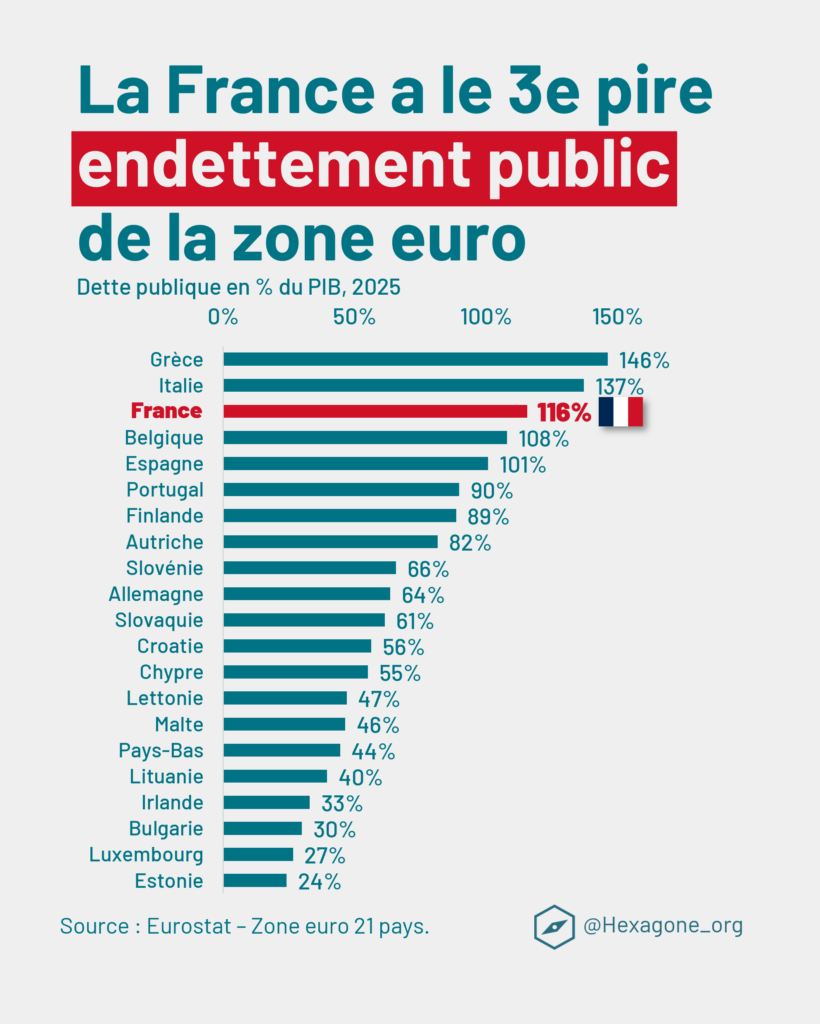 La conséquence directe de ces déficits accumulés est l’explosion de l’endettement. En 2025, la dette publique française atteint 116 % du PIB, dépassant même le pic historique enregistré durant la crise sanitaire. La France est aujourd’hui le 3e pays le plus endetté de la zone euro.
