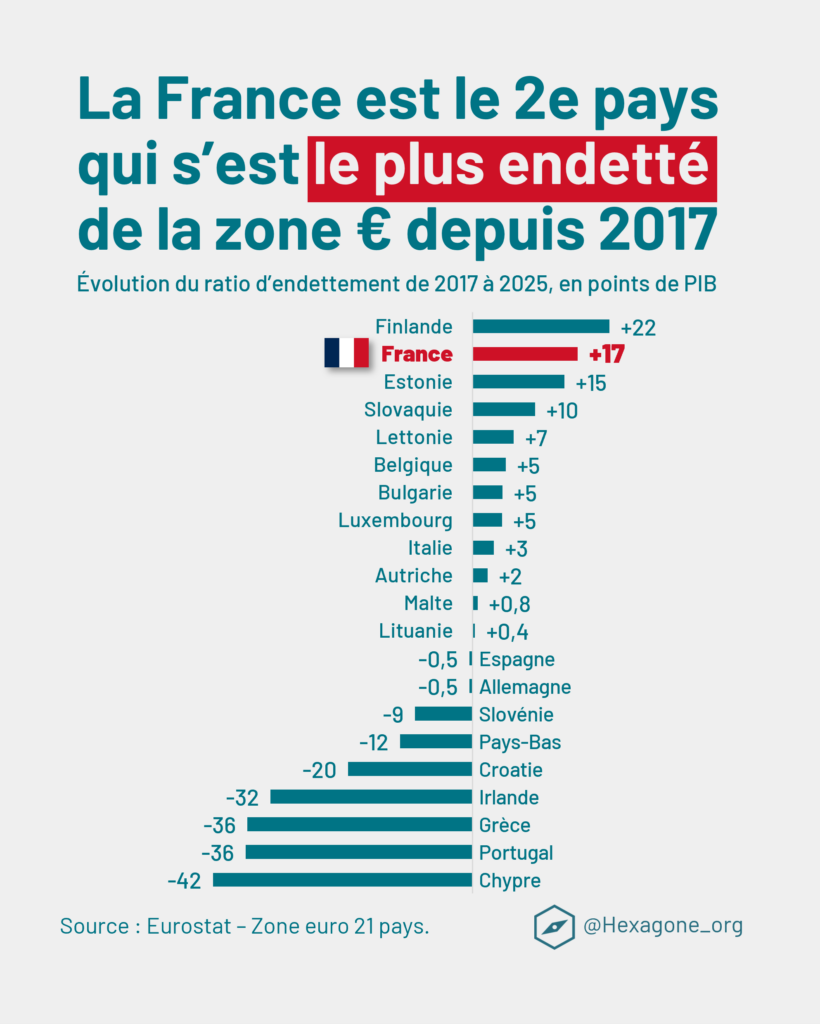 C’est la vitesse de cette progression qui alarme le plus les observateurs. Depuis 2017, la France est le deuxième pays de la zone euro à s’être le plus endetté en points de PIB (+17 points). À titre de comparaison, sur la même période, la dette de l’Italie n’a progressé que de 3 points, tandis que l’Allemagne et l’Espagne ont réussi à réduire légèrement leur ratio d’endettement (-0,5 point).